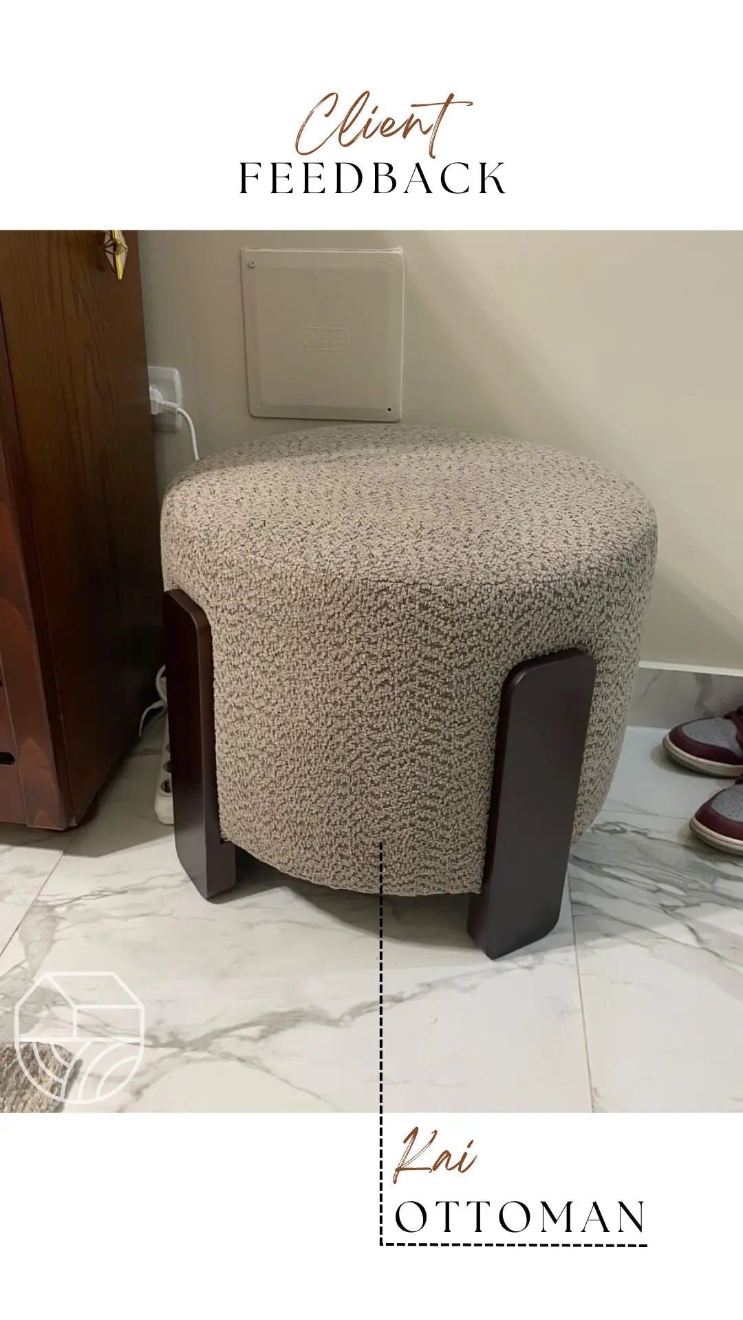 A chic, functional ottoman with a rounded upholstered design and wooden leg accents. Perfect for adding an extra layer of comfort and elegance to your living space.